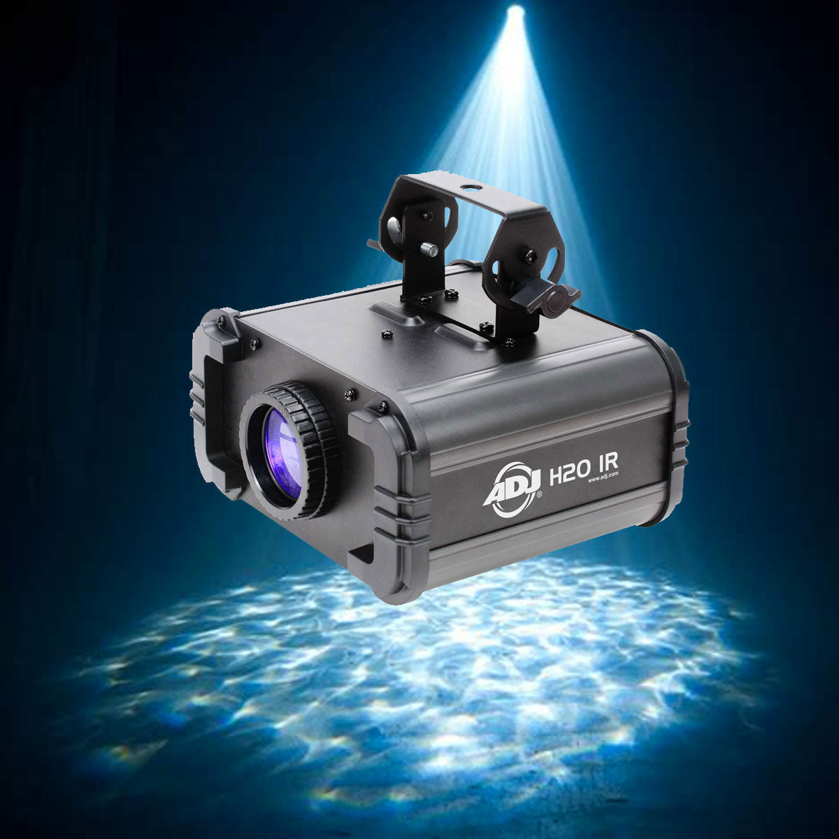 The ADJ H2O IR is a multi-colored simulated water flowing effect with a 12W LED source. The unit produces almost no heat, requires very little power (23.8W max) and can be used all night long. The LED is rated at 30,000 hours of use. The unit comes equipped with two interchangeable lenses (34 and 43-degree) depending on how wide of a beam is required for your event. The H2O IR is compatible with the UC IR wireless controller (sold separately). There’s no end to applications for the H2O IR. CET customers use these water-flowing effects to add a unique visual dimension to nightclubs, bars, restaurants, shows, music, museums, performances, and even displays and special events. The H2O IR may be used with or without the use of fog.