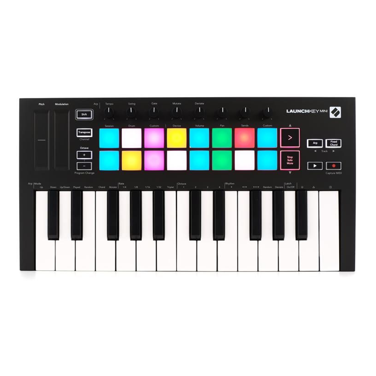 The Novation Launchkey Mini MK3 is a 25-key USB MIDI keyboard controller optimized for portability and tight integration with Ableton Live. It features 16 velocity-sensitive, multicolor, backlit trigger pads that can be used to launch loops, samples, and more, while the eight knobs enable access to mixer functions and instrument/effect parameters. The USB-powered controller is compatible with a variety of DAWs and apps on Mac/Windows computers and iOS devices (adapter cables available separately).